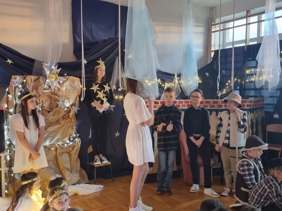 Po dwuletniej przerwie 14 stycznia odbyła się w naszej szkole zabawa choinkowa. Na początku Pani Dyrektor przywitała wszystkich uczniów, rodziców oraz zaproszonych gości, a następnie uczniowie klas 0-VIII zaprezentowali przygotowane przedstawienie jasełkowe, które choć przez chwilę pozwoliło poczuć magię świąt.