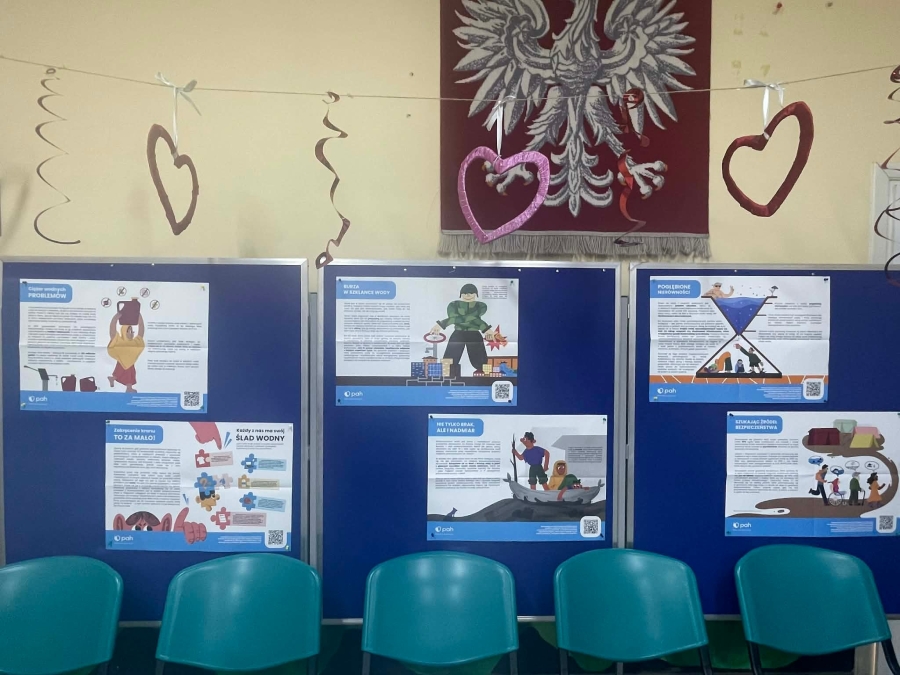Na szkolnym korytarzu można również obejrzeć wystawę plakatów poświęconych tematyce wody.